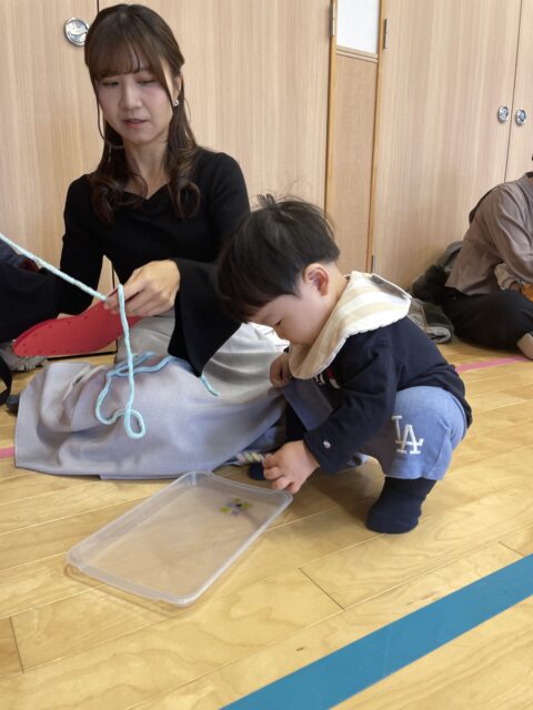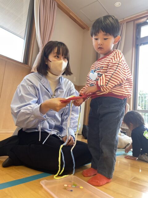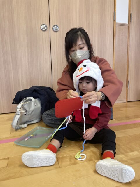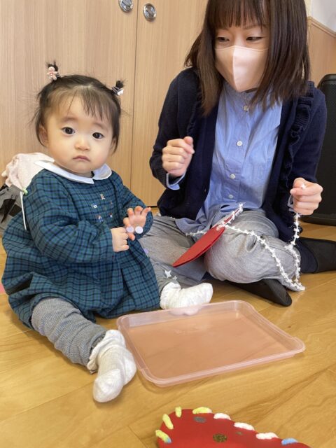 親子で一緒に毛糸を通して