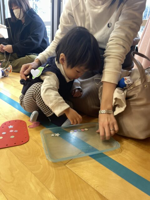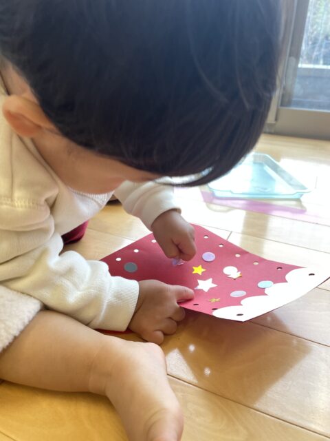 小さな手で一生懸命にシールを貼り、
